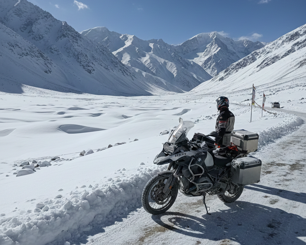Pack smart: Layered clothing (thermals, jackets, rain gear), riding essentials (helmet, gloves, knee guards, boots), toolkit, spare parts (tubes, chains, spark plugs), and high-altitude medicines like Diamox for Acute Mountain Sickness (AMS). Carry portable oxygen cans, energy bars, and a first-aid kit. Fuel up at every station, as pumps are sparse—plan for 200-300 km stretches without one. Join rider groups on Facebook or WhatsApp for real-time updates on road conditions, or apps like Bikers Diary.